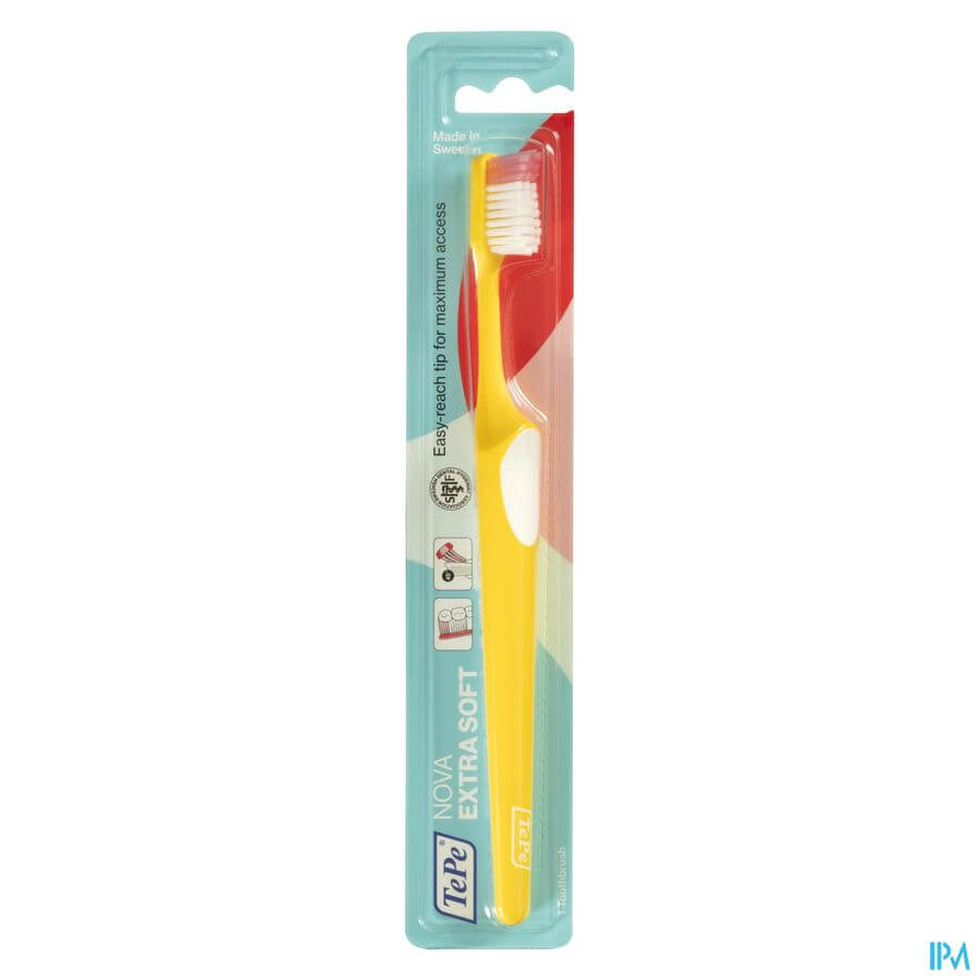 La brosse à dents TePe Nova Extra Soft a une tête de brosse effilée avec un embout facilement accessible pour mieux accéder aux zones difficiles à atteindre.